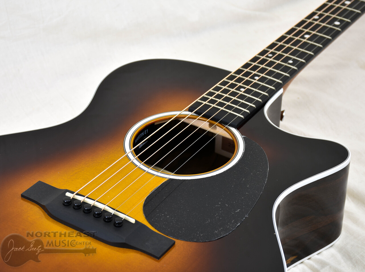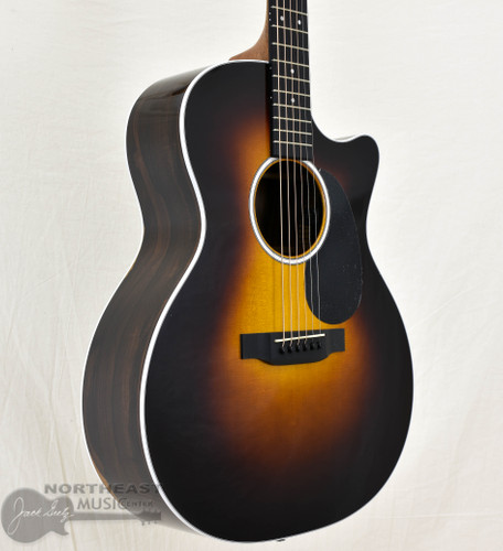 With a gorgeous glossed spruce top and ziricote back and sides, this Grand Performance cutaway model is a great sounding guitar at an affordable price. New to this model are stunning mother-of-pearl pattern fingerboard and rosette inlays, a multi-stripe rosette border, and white binding. It has an FSC® Certified Richlite® fingerboard and bridge, gloss body, and a hand-rubbed neck finish. Also new to this model is a Martin E-1 electronics package with a built-in soundhole tuner so you can tune up any time without using a pedal. This guitar comes with a burst option and Premium Soft Shell Case so it is Road-ready to join you on all of your adventures!