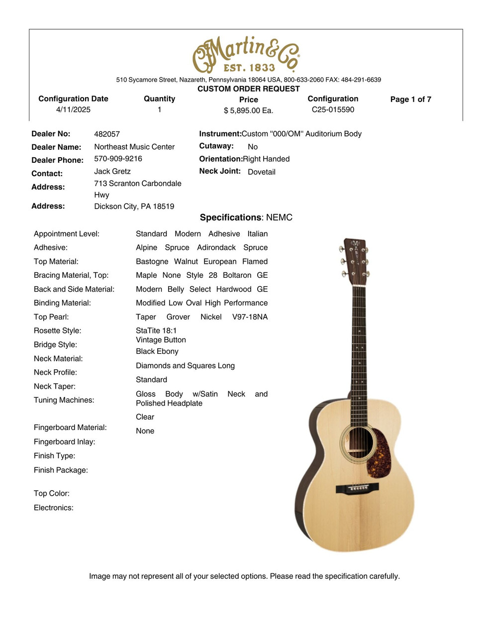 All woods and specifications were chosen carefully by the team at Northeast Music Center Inc. on site at the Martin Factory in Nazareth, PA.