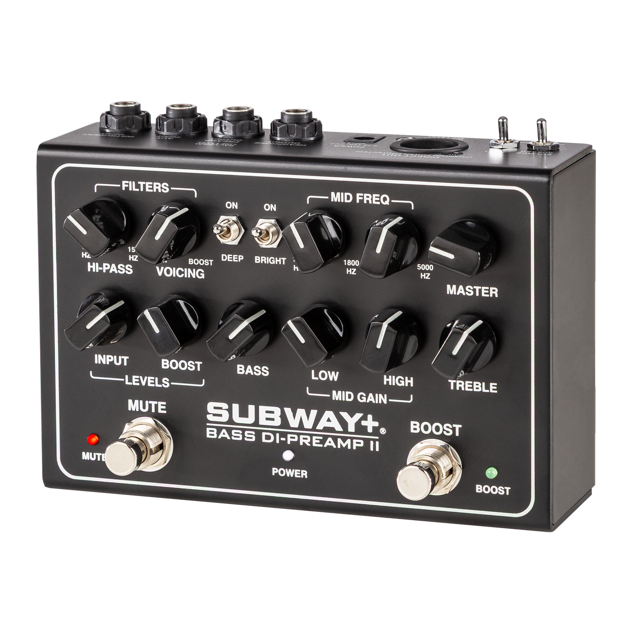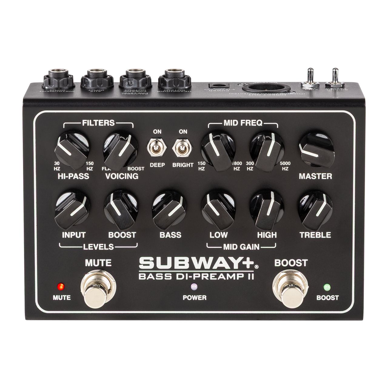 The Subway+ Bass DI-Preamp II’s musically rich architecture easily adapts to active or passive basses thanks to its extended-range J-FET preamp. An Input Mute footswitch silences the outputs for quiet tuning, while the Deep switch adds roundness and the Bright switch introduces bite and sparkle to the top end.