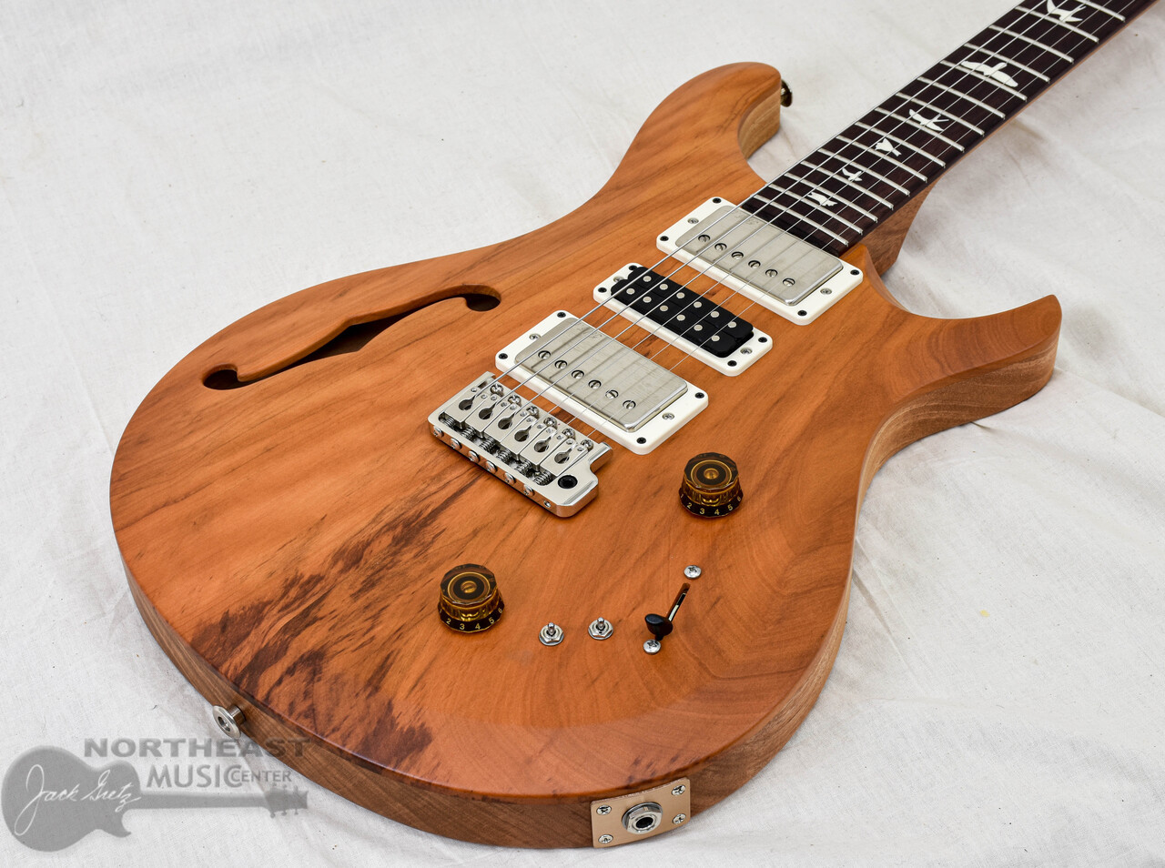 The woods featured on this model include a Peroba Rosa top, Cuban mahogany neck, and Guaribu fretboard. Peroba Rosa, typically used as siding in Brazil, was selected for the top wood. The density of this 100-150 year old wood combined with the semi-hollow body construction gives the S2 Special Semi-Hollow Reclaimed Limited Edition a unique sound that is punchy but also warm and full. The Cuban mahogany used for the necks was purchased from Puerto Rico; some of this wood was salvaged from trees blown down by Hurricane Maria in 2017. Finally, the Guaribu Preto fretboards are sourced from Brazil, where this wood was historically used as support beams for houses. These guitars are left Natural in color and finished in satin nitro. Any nail holes, wear, or discoloration have been left in the top wood to showcase its history.