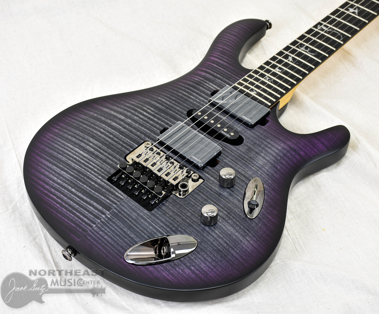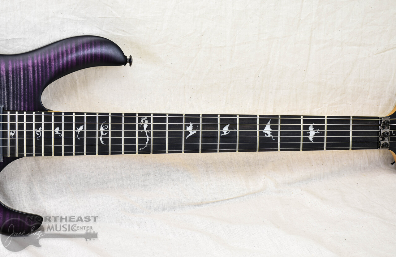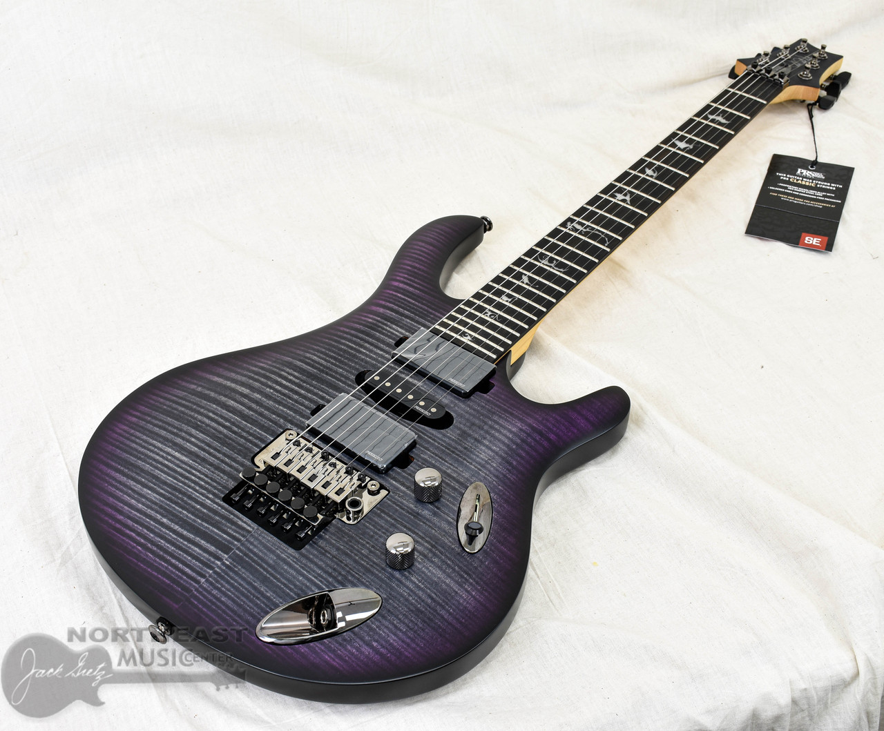 The PRS SE Chleo features a maple top and mahogany back with maple neck and ebony fretboard. The body features a sculpted carve that allows it to be very thin and very lightweight overall, so you can play longer and with more energy. The neck shape and neck joint were specially designed to be comfortable and fast. The neck is very thin front-to-back with a slightly taller playing surface and 20” fretboard radius, and the added high-modulus carbon fiber strength rods ensure a strong neck that promotes sustain. The fretboard features “Eclipse Dragon” inlays, and PRS’s trademark scoop has also been modified for ultimate access to the upper frets. All this plus a Floyd Rose locking tremolo mean you can dig in and play hard without sacrifice.