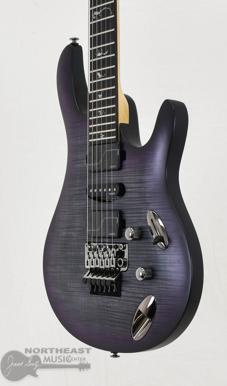The PRS SE Chleo features a maple top and mahogany back with maple neck and ebony fretboard. The body features a sculpted carve that allows it to be very thin and very lightweight overall, so you can play longer and with more energy. The neck shape and neck joint were specially designed to be comfortable and fast. The neck is very thin front-to-back with a slightly taller playing surface and 20” fretboard radius, and the added high-modulus carbon fiber strength rods ensure a strong neck that promotes sustain. The fretboard features “Eclipse Dragon” inlays, and PRS’s trademark scoop has also been modified for ultimate access to the upper frets. All this plus a Floyd Rose locking tremolo mean you can dig in and play hard without sacrifice.
