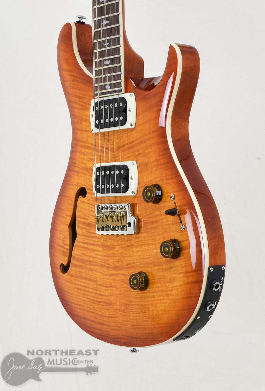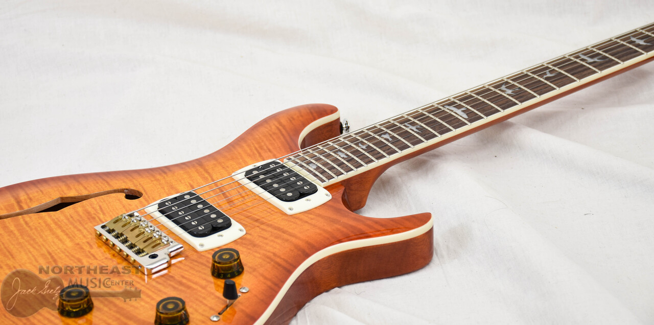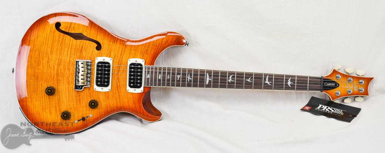 Additional details include a matching headstock veneer, headstock and fretboard binding, and lampshade knobs. With nearly infinite tones and roadworthy reliability, the PRS SE Custom 24 Semi-Hollow Piezo is a modern classic that looks and feels as good as it sounds.