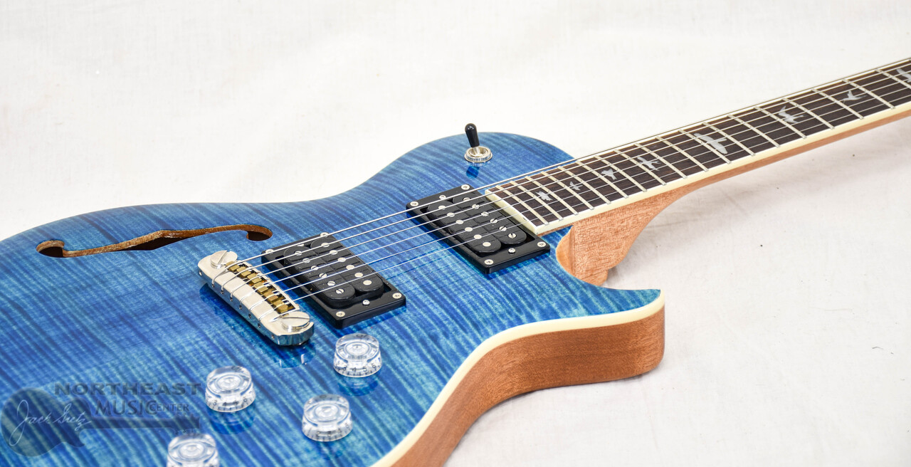 The SE Zach Myers is packed with features that will satisfy even the most demanding musicians. Featuring a chambered mahogany body with maple cap, flame maple veneer, and single f-hole, the SE Zach Myers provides smooth mid-range tones with a natural, resonant internal reverb. The resonance of the semi-hollow body paired with the smooth feel of the satin finish neck will make an immediate impression in your hands. Additional appointments to the SE Zach Myers signature model include a 22-fret, 24.5” scale length neck, PRS adjustable stoptail bridge, vintage-style tuners, and PRS-designed 245 “S” pickups paired with two volume and two tone controls and a 3-way toggle pickup switch. These pickups bring high-end clarity, low-end power, and an overall aggressive punch that maintains a certain sweetness.