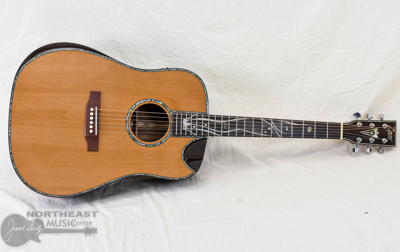 This Used Zaar Acoustic Dreadnought features a Solid Cedar top with Layered Ziricote Back & Sides.